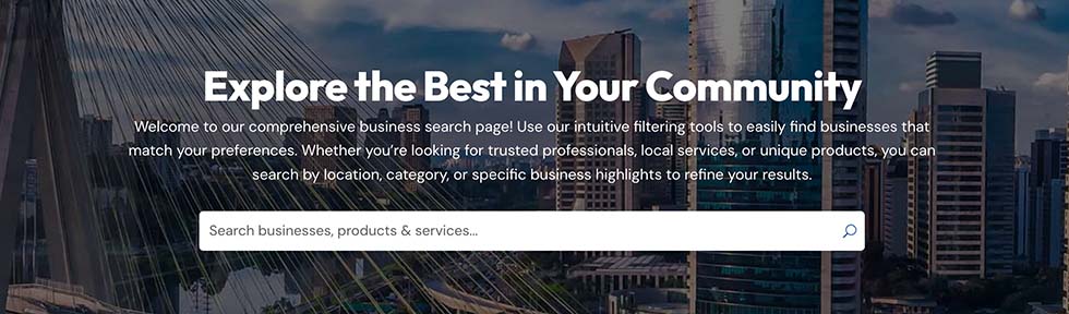 Use the search bar located in the header of our website or across various pages to look up businesses directly by name, service, or keyword.